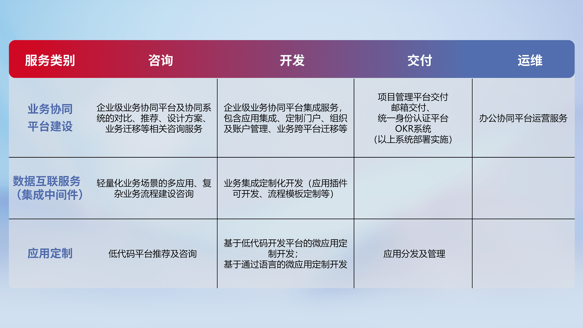 针对钉钉、、、企微、、、IDaas等平台级产品提供产品的规划、、、、方案、、、、交付、、定制化开发等服务,,实现如统一协同办公、、智能客户服务、、混合会议管理、、、、智能数据查询、、、、等业务场景,,实现数字化转型。。
